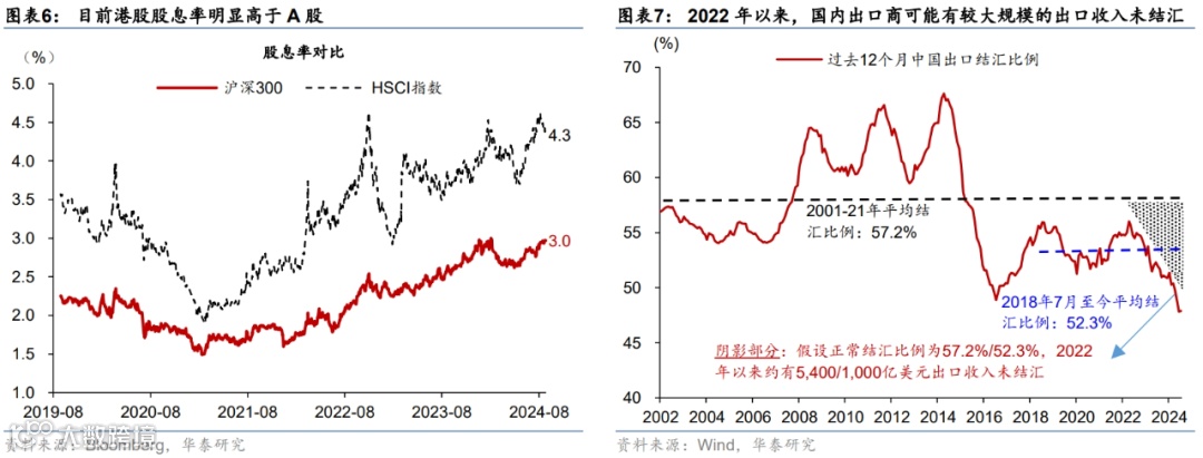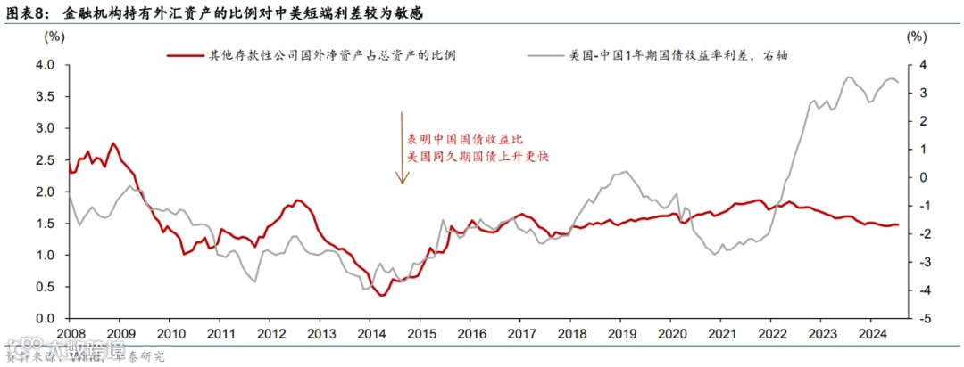 随着美国降息临近,持有美债的机会成本下降,有助于资金回流新兴市场。中美短端利差有望快速收窄,可能进一步降低持有香港的股息类资产的机会成本,同时,也可能边际促进国内出口商和金融机构结汇。目前,随着市场的调整,港股的股息率达到4.3%,明显高于A股的3%(图表6)。如果联储将短端利率从目前的5.25-5.5%左右降至3.25-3.5%之间,将很大意义上降低持有香港资产、尤其是稳定回报产品的机会成本。同时,2022年以来,随着美联储快速加息,中美短端利差走阔,国内出口商的结汇意愿持续回落。基于2001-2021年的平均结汇比例来估算,2022年以来国内出口商可能有5,400多亿美元(约合3.8万亿人民币)的出口收入未结汇(图表7);即使用2018年7月后较低的平均结汇比例测算(52.3%),2022年来未结汇的海外收入也可能达到1,000亿美元(约合7,400亿人民币)。某种意义上,减少结汇也是人民币“套息交易”的一种表现形式。随着美联储降息下中美利差收窄,不排除人民币出现阶段性套息交易逆转——而人民币走强会进一步促进结汇意愿。同时,金融机构持有外汇资产的比例对中美短端利差也较为敏感,其未来结汇需求也可能升温(图表8)。