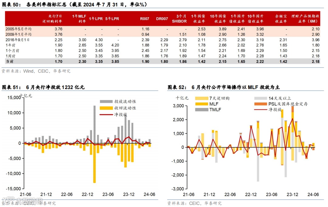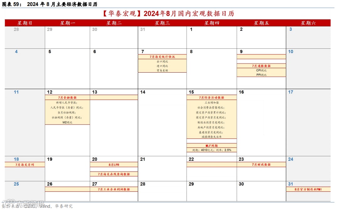 政策及事件:1)7月30日,中央政治局会议指出要坚定不移完成全年经济社会发展目标任务,宏观政策要持续用力、更加给力。2)7月21日,二十届三中全会《决定》全文提出包括新型城镇化、土地、财税体制改革、推动科技创新和扩大高水平对外开放等多项改革措施。3)7月25日,国家发改委、财政部统筹安排3,000亿左右超长期特别国债加力支持大规模设备更新和消费品以旧换新。4)7月以来,央行宣布开展国债借入、临时正逆回购、阶段性减免MLF质押品等多项货币政策框架转型升级举措。
