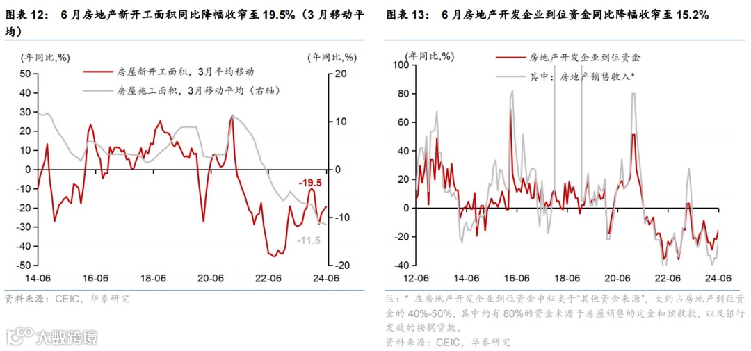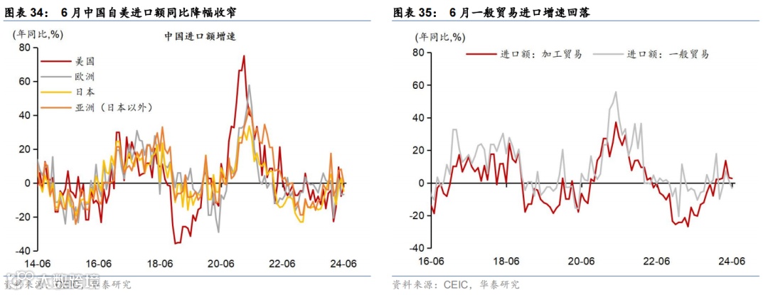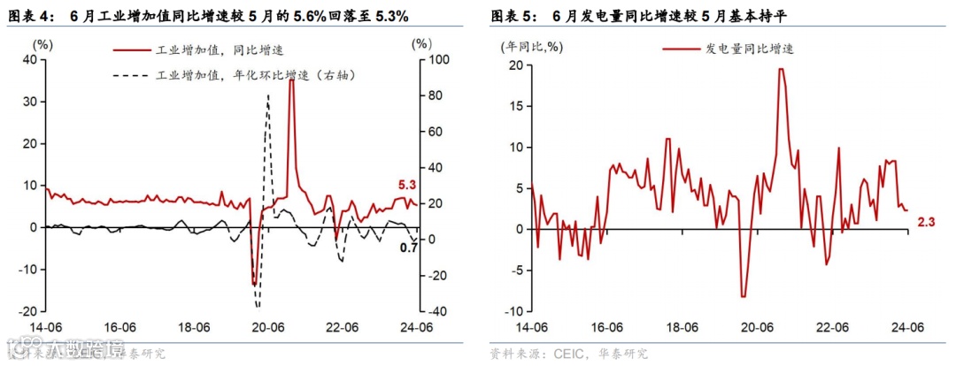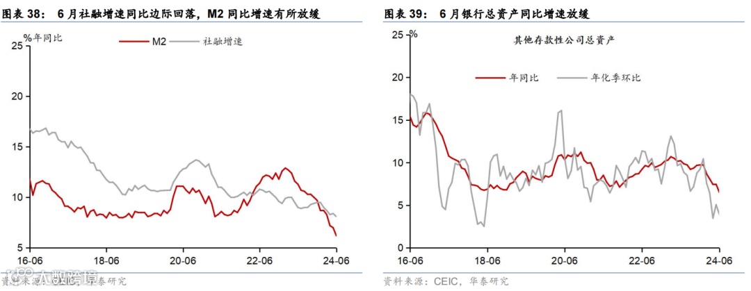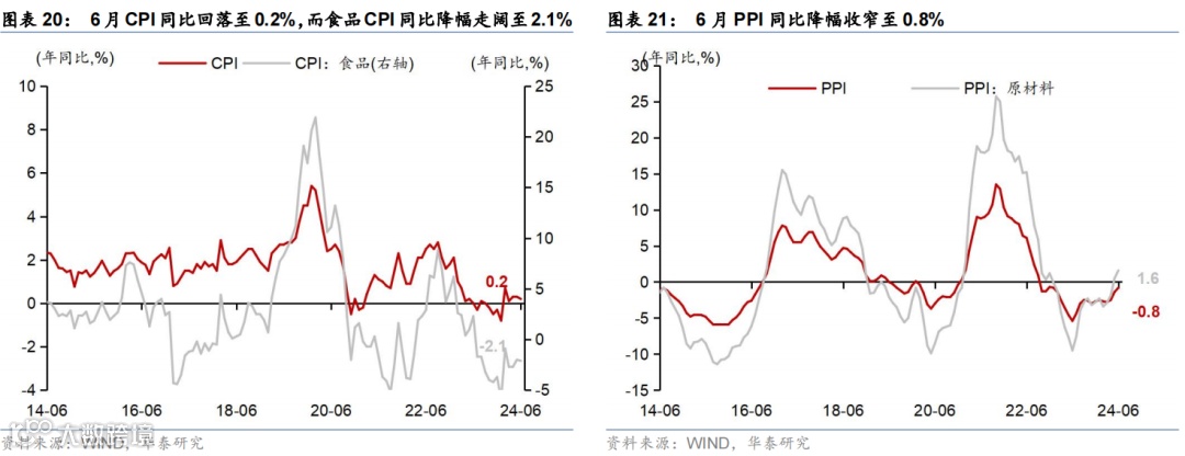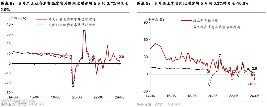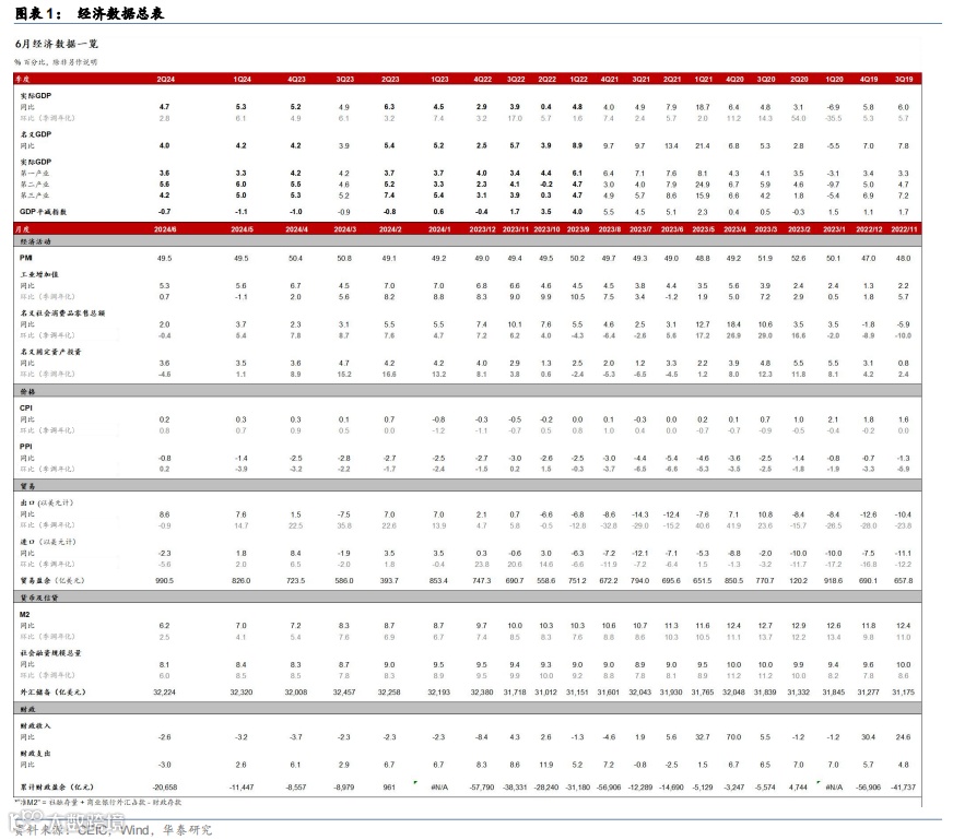 6月重要宏观数据回顾:1)2季度实际/名义GDP增速从1季度的5.3%/4.3%回落至4.7%/4%;2)6月工业增加值/社零同比增速回落至5.3%/2%,而固定资产投资同比增速回升至3.6%。3)6月美元计价出口同比增速进一步上升至8.6%,而进口金额同比增速回落至-2.3%。3)6月CPI同比增速较5月的0.3%回落至0.2%,PPI同比降幅则从5月的1.4%继续收窄至0.8%。4)6月M1同比降幅从5月的4.2%走阔至5%,反映“挤水分”影响仍在。