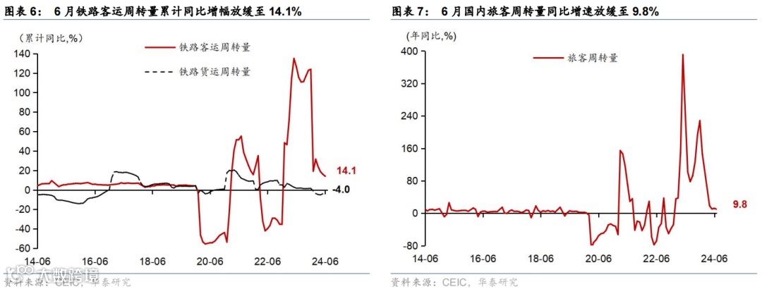 高频数据显示暑期旅游或呈“量增价跌”,出口保持较强韧性、投资活动偏弱,新房成交仍偏弱,一线城市二手房成交走强。暑期出行较为活跃、但餐饮酒店等价格同比回落,7月1-22日,全国铁路发送旅客数同比增长6.5%;7月1-29日国内航班数同比较6月的-1.2%转正至3%,但线上购票平台数据显示暑期国内航线、酒店均价同比回落6-8%;7月1-28日,乘用车日均零售销量同比降幅较6月的8%收窄至3%。物流增速同比回落,截至7月31日,整车货运物流/公共物流园区吞吐指数同比增速较6月的-4.7%/0%放缓至-5.1%/-1.2%;出口高频指标HDET显示7月出口同比或较6月上行、但环比延续放缓态势。基建和建筑活动开工同比偏弱,高炉/焦化/水泥开工率月均同比回落0.7/3.4/5.8ppt,建筑钢材成交量同比降幅较6月的22.9%走阔至23.4%。商品房成交同比边际改善,7月全月,60城新房/26城二手房成交面积同比增速较6月的-24.8%/12.1%回升至-20.8%/25%,其中一线城市二手房成交同比较6月的35.1%大幅上行至60.6%。