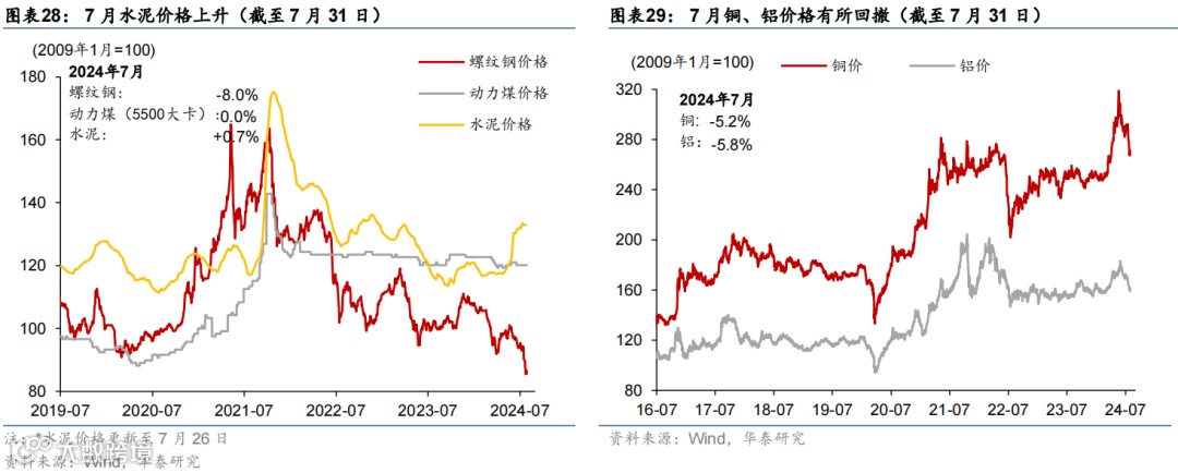 通胀:国际原油、国内金属价格均回落,猪价延续上涨。截至7月31日,布伦特油价全月累计环比回撤6.6%至80.7美元/桶,而COMEX黄金月环比走高5.7%至2,473美元/盎司;国内原材料价格方面,铜/铝/螺纹钢价格环比回撤5.2%/5.8%/8.0%。农产品方面,猪价受供应偏紧提振持续反弹、全月累计环比上行3.9%,玉米/小麦/棉花价格月环比回落1.6%/0.3%/2.6%。