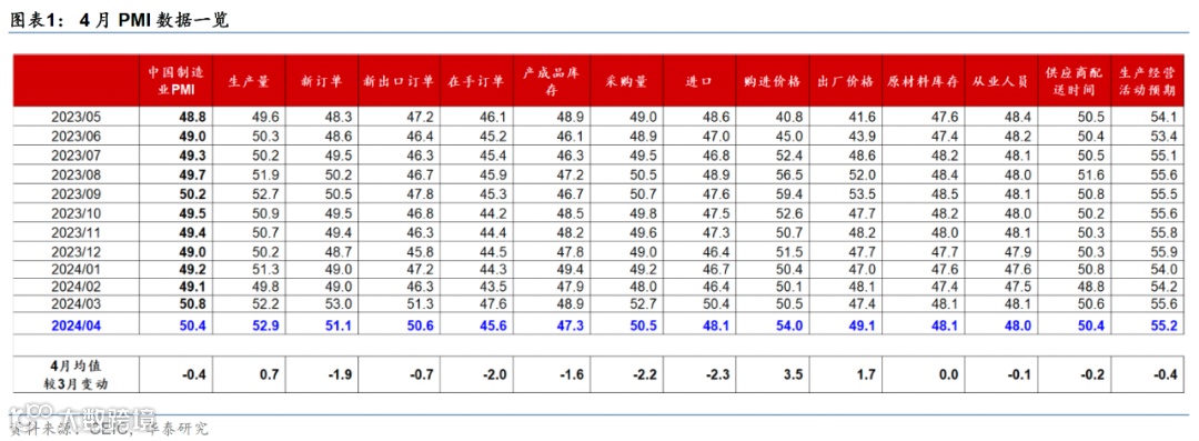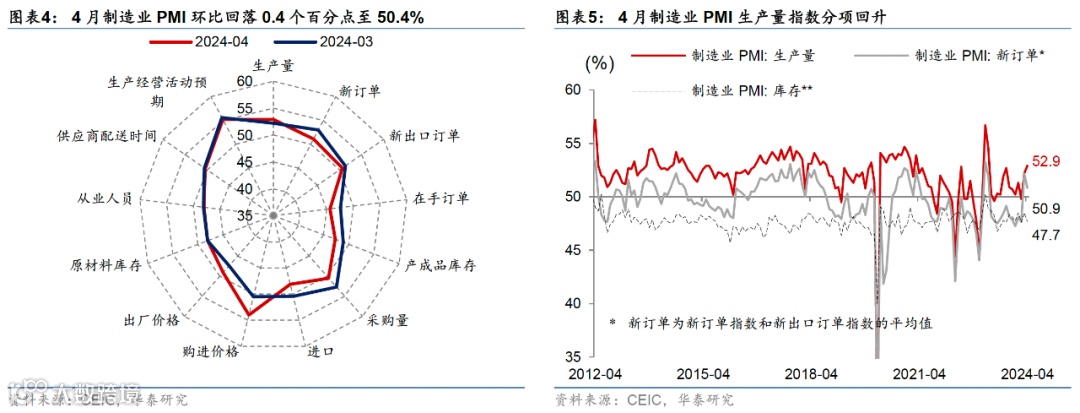 2024年4月制造业PMI较3月季节性回落0.4个百分点至50.4%(彭博一致预期50.3%)、连续2个月位于扩张区间;非制造业PMI较3月回落1.8个百分点至51.2%(彭博一致预期52.2%)。综合来看,4月PMI边际回落,但分项中新出口订单指数仍有韧性、与我们出口高频指标HDET追踪的4月出口环比增速放缓、但同比反弹相匹配;此外,原材料价格继续上行、出厂价格指数亦有企稳,或显示需求大体平稳,4月PPI同比有望降幅收窄、但不同行业的价格及景气度水平可能延续分化格局。