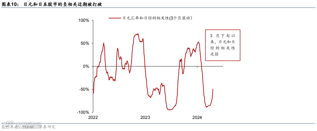 日元贬值将提振本国通胀水平,然而,近期一些迹象表明,日元贬值推升盈利的传导机制不像此前顺畅,或许意味着日元贬值对通胀预期的边际提振在减弱。2020年来,日元贬值对本国通胀的提振作用较为明显(图表9)。正如我们在《为何日本经济“衰退”但股市表现强劲?》(2024/3/4)中论述的,日本通缩预期转为通胀预期,是对企业现金流和表观投资回报率改善最重要的宏观变量。然而,我们观察到,近期日元加速贬值可能并不进一步对应着资本流入,对股市的盈利预期和资金流入不再有明显的正向推动——4月日元加速贬值后,日本股指不再像此前有积极的反应(图表10)。这可能意味着,过快、甚至“失锚”的贬值,反而可能边际损害股市的流动性和投资热情、尤其是对于海外投资者而言。众所周知,股市的繁荣是居民和企业资产负债表修复、扩张,通胀预期上行的重要标志,所以,日本股市和汇率此前的反相关近期被打破,值得深思。