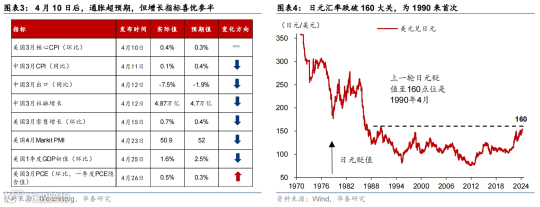 一天后的4月26日,日央行议息会议再度明显比市场预期的鸽派。由于此前日元贬值加速并冲破155的点位,会前市场对日央行采取措施抑制日元贬值有一定的预期,如进一步的加息指引、抑或减缓扩表速度等等。但会议上,多个信号指向日央行似乎无意干预日元贬值——例如,日央行并未明确给出进一步加息指引或减缓扩表速度。此外,虽然日央行在4月议息会议上上调了2024财年的(日本定义,不含新鲜食品的)核心CPI预测0.4个百分点至2.8%,但对2025财年日本式核心CPI的上调幅度仅0.1个点至1.9%,仍然低于2% 的政策目标,显示日央行对通胀持续性仍有疑虑,隐含偏鸽派的政策组合可能延续(参见《日央行仍然偏鸽,暂不会加息应对贬值》,2024/4/26)。日央行议息会议后,美元兑日元一举突破158。