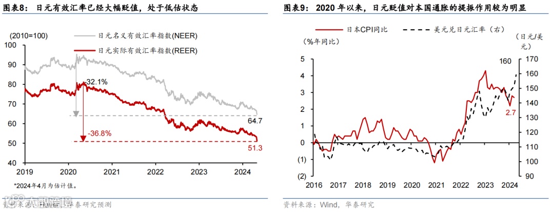 往前看,日元汇率走势取决于日本本国的货币政策取向,及海外、尤其是美国利率走势。中长期,真实汇率由真实投资回报率决定。短期到中期,如果日央行仍然由于对此前30年的通缩经历“心有余悸”而维持极为鸽派的立场,那么日元总体可能维持较弱的走势。此外,如果美国降息预期进一步下降,那么,市场对日元套利交易的热情可能易涨难跌。然而,如果美国降息预期回升、或者日本货币政策立场发生边际变化,则日元汇率有支撑——鉴于日元兑美元汇率2020年来已经近乎腰斩,日元目前处于大幅低估水平(图表8)。中长期看,真实汇率水平由日本相对海外的真实投资回报率差而决定,所以,日本亟需加大结构性改革力度,进一步提升投资回报率以支撑日元估值。