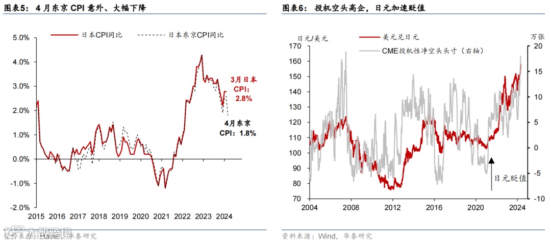 上周四(4月25日)的东京CPI数据发布后,日元贬值再度加速,而上周五(4月26日)的BOJ会议较为鸽派的表述及更为鸽派的实际行动,叠加海外市场对本周日本“黄金周”假期期间政策/干预“真空期”的强烈共识下,日元套利交易再掀高潮,日元失速下跌,今年上午一度触及(美元兑日元)160的关键点位,具体复盘如下(图表4):