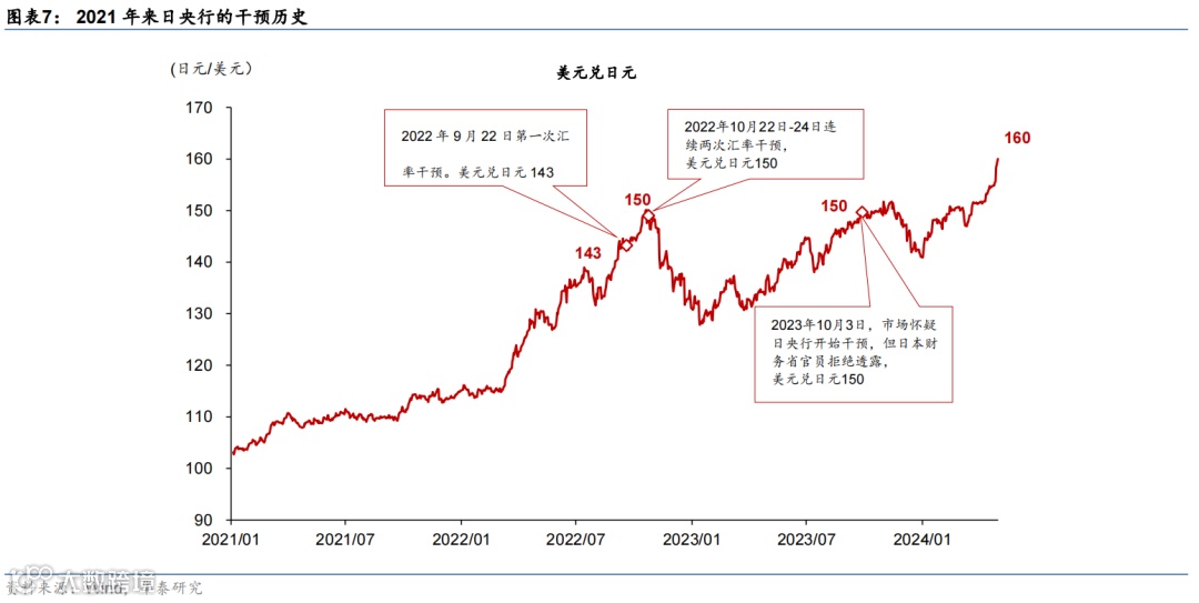 回顾近年日央行对日元汇率的几次干预,其中不乏在汇率快速波动的期间不立刻做出回应,但“事后公布”的例子。比如2022年10月22-24日日央行对汇率的干预。图表7显示,当日元快速贬值和/或击穿关键点位后,日央行往往会进行干预,阻断日元过快贬值的势头——过去三次干预分别发生在美元兑日元143、150、150的位置)。所以,这次日元触及160,不排除日央行再度“出手”。