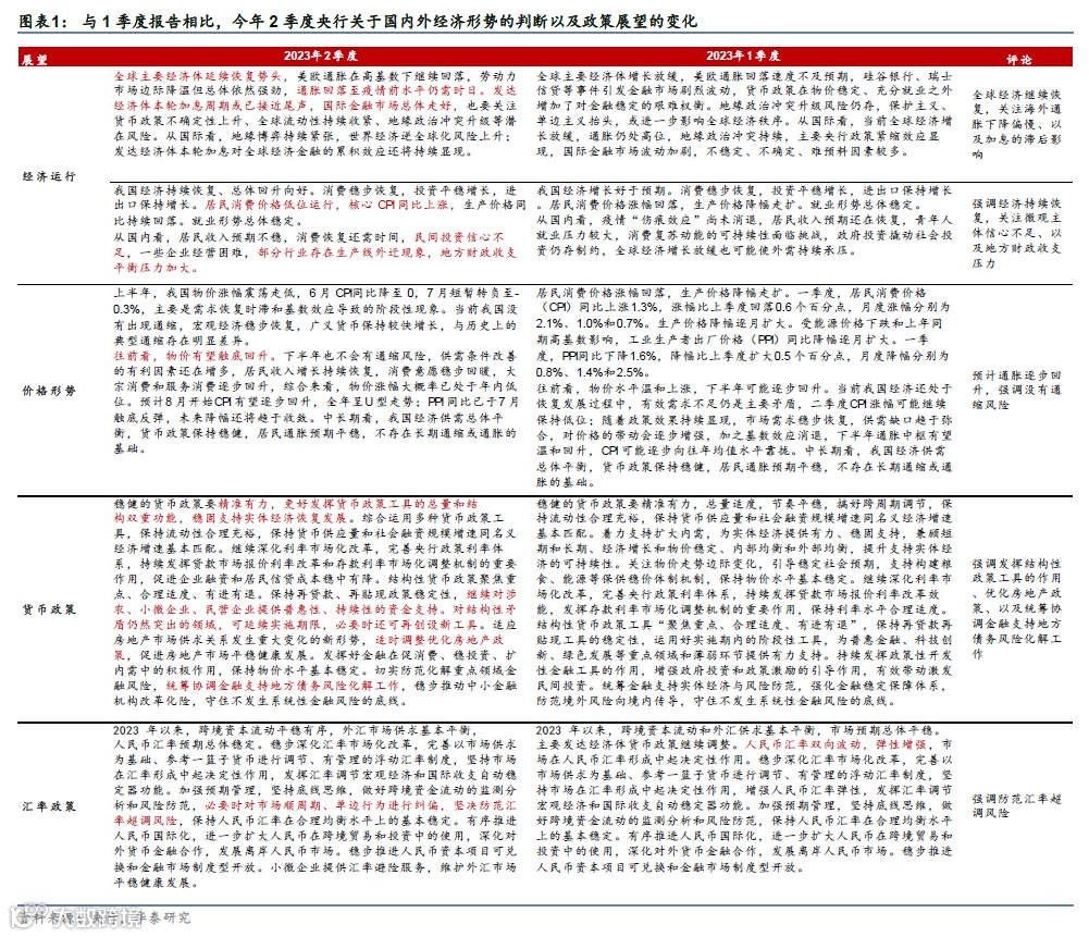 分析结论:货币政策可能维持“托而不举”的基调。周期性政策或将继续顺势宽松,但由于强调保持汇率稳定,每次降息幅度可能相对温和;结构性货币工具或仍是央行加大逆周期调节的主要工具。央行表示保持货币信贷总量适度、节奏平稳,并推动实体经济融资成本稳中有降。同时,央行强调稳定汇率预期,用好各项调控储备工具来防止汇率超调。此外,央行表示将继续通过结构性货币政策对重点领域和薄弱环节提供融资支持。如我们在《央行再度顺势下调市场操作利率》(2023/8/15)中分析,如果经济基本面进一步承压,不排除央行有进一步降准降息的空间,但考虑到汇率制约,央行每次降息的幅度可能相对温和,且更多是“顺势而为”。