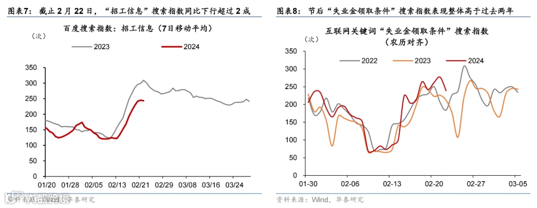 从百度搜索指数来看,春节后与企业招工需求的“招工信息”的搜索量较2023年有所滞后、且回升幅度略低,截至2024年2月22日,当周“招工信息”周均搜索量较2023/2019年分别下行20.4%/95.3%;而与劳动力市场供给相关的“招聘”的搜索量同比回落约2成,环比回升速度亦低于22/23年同期。“失业金领取条件”的搜索量较2023年稍有滞后、且回升幅度更高,较2023/2022年同比增长13.3%/13.6%。