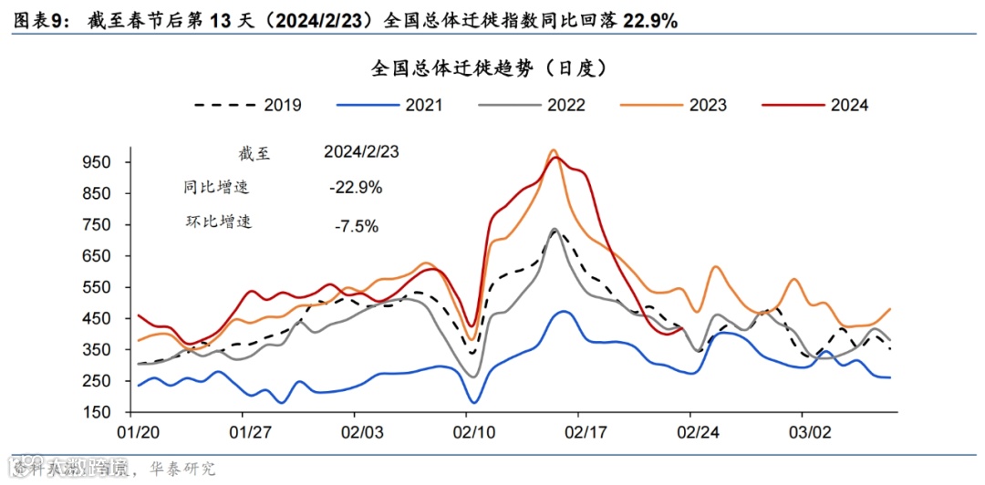 百度迁徙指数同样显示大年初八后日均活动量开始回落,节前(腊月十六至腊月三十)日均迁徙指数均值较2023/2019年(腊月十六至腊月二十九)分别上行2.4%/15.4%,(正月初八至正月十四)日均迁徙指数均值较2023/2019年(正月初七至正月十四)分别变化-9.1%/10.5%、均较节前增速回落,可能显示复工返程活动或有所降温。