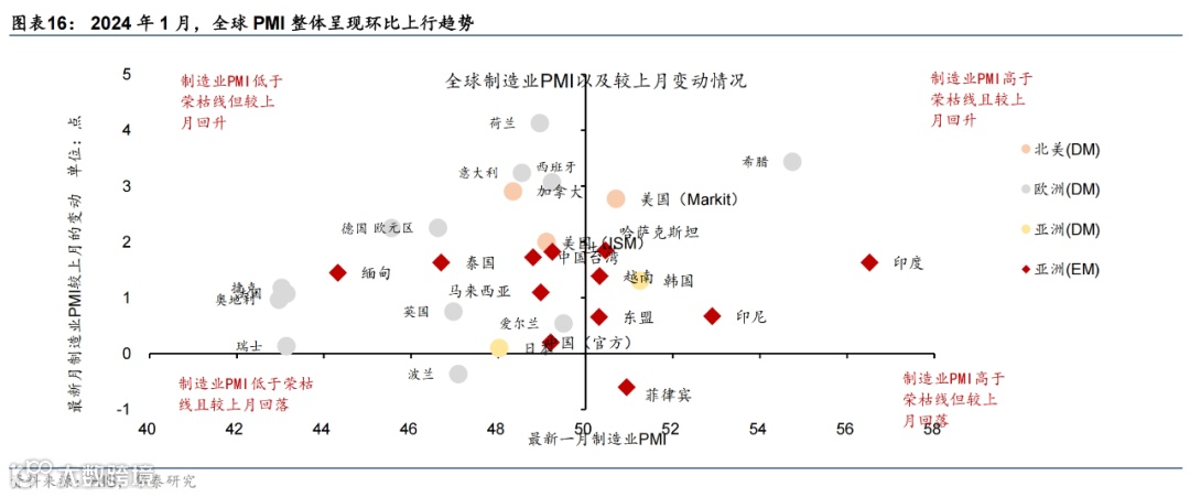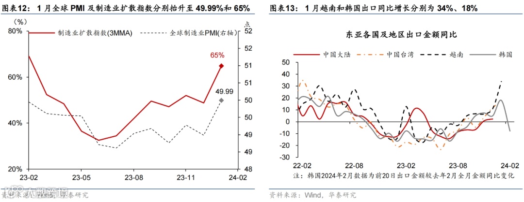 全球制造业周期弱复苏背景下、春节因素调整后的外贸相关指标有望保持韧性。华泰出口需求日度指数(HDET)显示今年1月出口同比继续回升至5%左右、而2月至今出口或小幅回落至1.1%。对比而言,1月整体东亚出口均有所走强,比如越南/中国台湾出口同比增长34%/18%(图表13),均较去年12月(-4%/+5%)明显提升,但2月韩国出口前20天的数据亦下行至-8%。考虑到全球制造业周期呈弱复苏态势,且中国出口竞争力进一步上升,出口增长有望保持韧性(参见《1月全球制造业PMI回升至荣枯线》,2024/2/16)。
