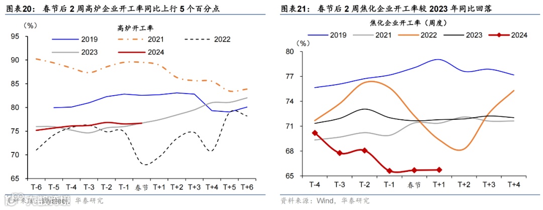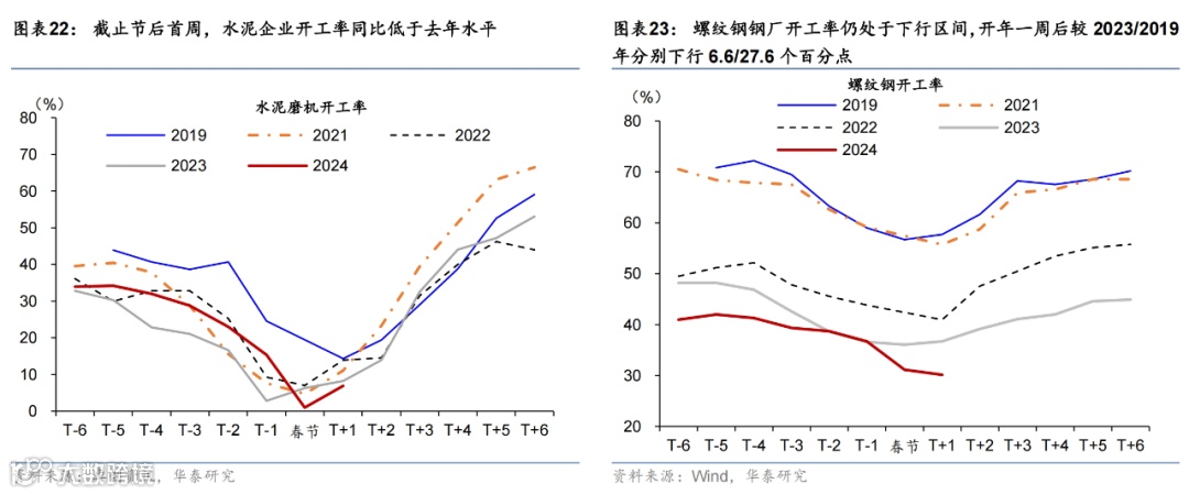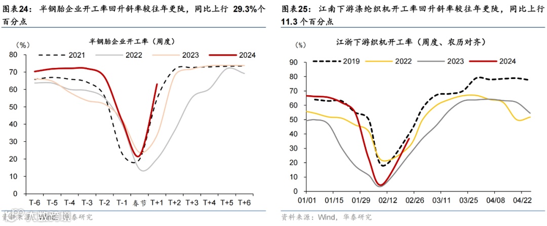 一方面,汽车、服装鞋帽行业复工速度较2023年明显加快,截至春节后两周,开年首周半钢胎开工率较2023/2019年同比上行29.3/8.4个百分点,节后环比回升斜率略高于2021年水平;江南下游涤纶织机开工率节后高于去年约11.3个百分点,且节后回升斜率趋陡、但较2019年回落约3.2个百分点。另一方面,螺纹钢钢厂开工率仍旧处于下行区间,开年一周后较2023/2019年分别下行6.6/27.6个百分点。