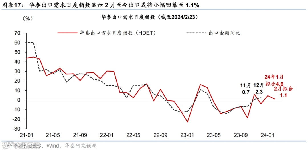 春节因素调整后的外贸相关指标有望保持韧性。华泰出口需求日度指数(HDET)显示1月出口同比回升至约5%、2月至今出口或小幅回落至1.1%。考虑到全球制造业周期呈弱复苏态势,且中国出口竞争力进一步上升,出口有望保持韧性(参见《1月全球制造业PMI回升至荣枯线》,2024/2/16)。