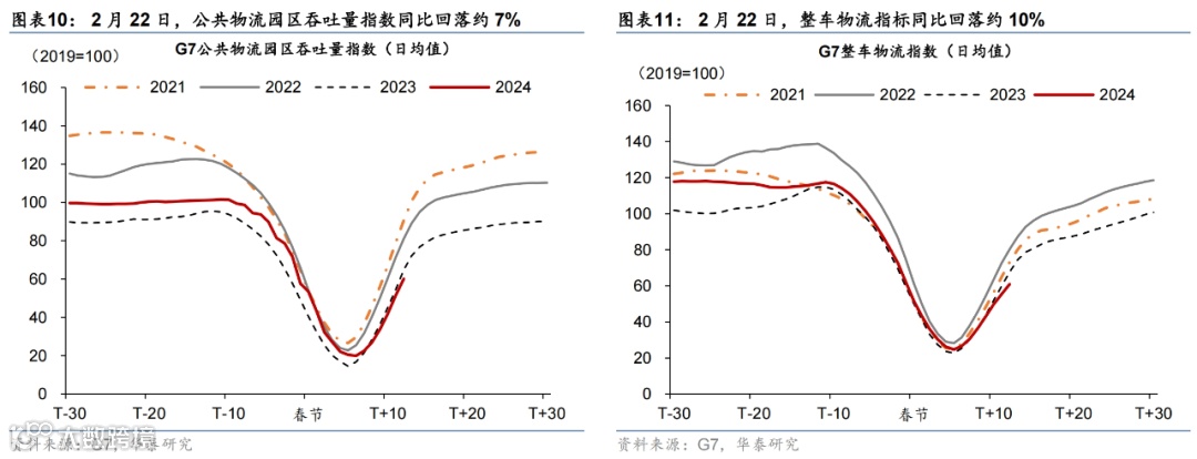 节后物流指标较23年偏弱、亦低于同样春节较晚的2021年。截至2月22日,整车物流指标修复至2023年日均的89.9%和2021年日均的83.2%;公共物流园区吞吐量指数修复至2023年日均的94.1%和2021年日均的67.5%。