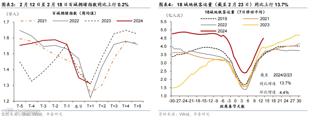 地铁出行方面,截至2024年2月22日,18城地铁客运量指数回升斜率不及2023年,周度整体客运量较2023年上行13.7%;百城拥堵指数较2月12至2月18日同比上行0.2%、部分可能体现较长春节出行活动较强,节后的市内拥堵指数回升仍待观察。