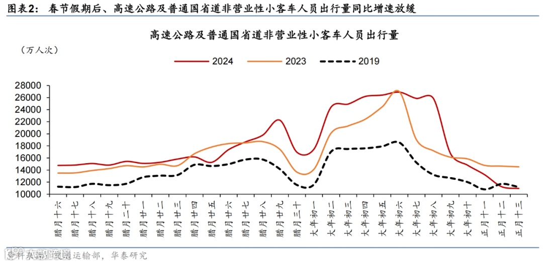 根据交通运输部公布的客运数据,节后(大年初八至十五)铁路、公路、水路及民航日均客运量较2023年(大年初七至十五)基本持平,而较2019年略回落0.8%; 其中铁路/公路/水路/民航节后较2023年同比分别为30.1%/-2%/10.7%/39%;而高速公路及普通国省道非营业性小客车人员出行量于大年初八达峰后迅速下降、节后日均人流量较2023回落5.4%(图1-2)。