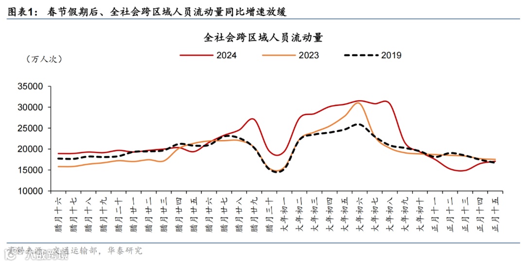 春运整体出行活动较强、但节前人流同比高增,节后人流增速明显放缓、隐含人员返工比例或不及去年。根据交通部数据,可比口径下,节前春运日均人流量(腊月十六至三十)较23年/19年(腊月十六至腊月廿九)同比回升10.9%/4.5%、而在年后(大年初八至十五)日均人流量分别较23年/19年同比仅录得0.1%/-0.8%的增长。粗略估计正月十五的返工比例可能为2023年的9成。值得注意的是,今年春节前学生/务工/探亲流错开、而节后相对集中,叠加春节较长,均可能对上述数据有影响。