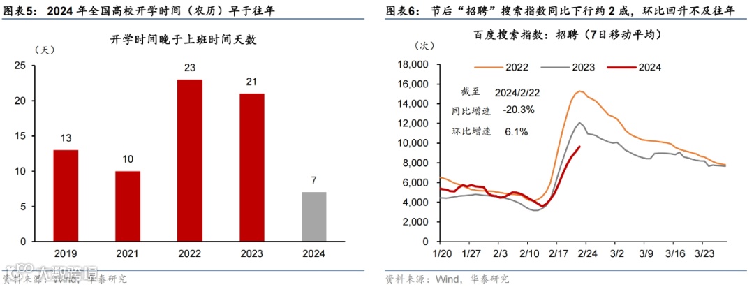 市内交通活跃度方面,节后一周出行活跃度约为1月均值6成,今年高校开学和法定返工日较接近,学生和探亲流回程较集中,但务工流可能相对偏弱。截至2月22日,18城周均地铁客运量较去年农历同期(下同)回升13.7%,较节前一周43.6%的增速有所回落,节后一周内环比回升9.2%、不及2023年的18.9%;此外,百度“招工信息”的搜索量节后一周内环比回升幅度为10.6%、不及2023年的16.2%。