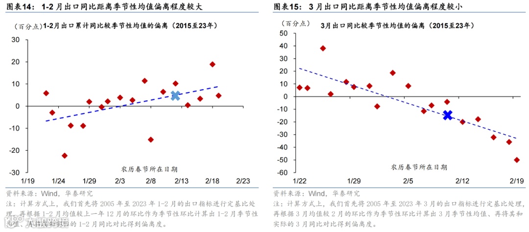 如我们在《假日错位+闰年因素扰动1-2月数据》(2024/2/5)中分析,通常春节前会出现“抢出口”现象,因此1月初通常出口有所回升,而节后出口商复工滞后于其他部门、春节时间相对越晚对3月的出口拖累便会越大(图14-15)。根据华泰出口需求日度指数(HDET)显示今年1月出口同比增速或继续回升至5%左右、而截至2月22日,出口指数小幅回落至约1.1%。