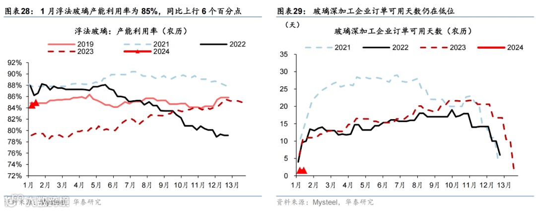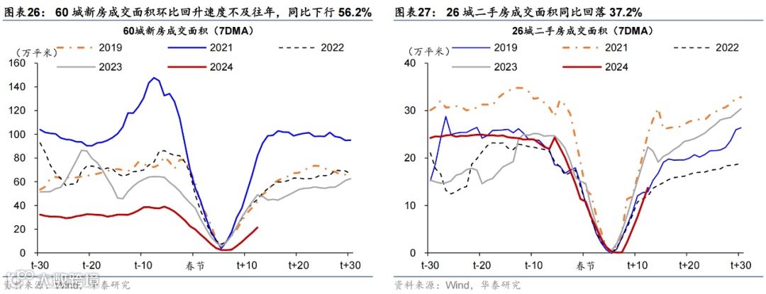 节后地产企业房产成交偏弱,春节对齐后同比降幅较节前走阔,水泥、玻璃等地产开工实物量亦呈现弱复苏态势。春节后新房成交面积不及19/23年,回升斜率低于往年,二手房成交面积不及23年,回升斜率与往年基本持平。