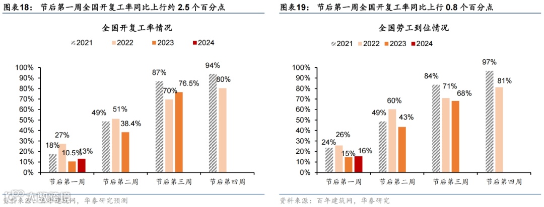 调研数据显示节后第一周全国施工项目复工率较2023年略有改善,但整体开工率低于2021/22年同期。百年建筑网第一轮施工项目复工调研显示,截止2月14日,全国施工企业开复工率为13.0%,同比去年(农历正月初十,2023/1/31)提升2.5个百分点;劳务到位率15.5%,同比去年上升0.8个百分点。但对比2022年,开工率和人员复工率分别回落14/10.5个百分点。但值得注意的是,部分工地或在元宵节后加速返工,3月初的情况或能更加全面体现实际复工进程。