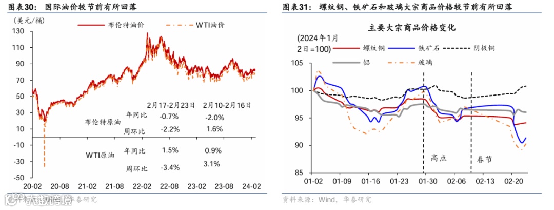 从大宗商品价格来看,节后首周布伦特原油价格环比回落2.2%至81.6美元/桶,截至2月23日,和建筑活动相关的螺纹钢、玻璃、铁矿石价格较春节前高点(1月29日)回落幅度分别为4.4%/9.6%/9.3%。