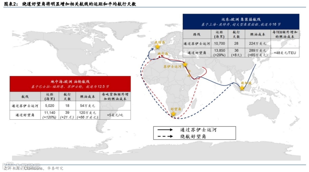 集运:如果绕道好望角,远东-欧洲航线运距或将增加3成左右,有效运力下降约20%,相当于全球运力下降7%左右。据克拉克森(Clarksons)研究估算,相比通过苏伊士运河,绕道好望角将导致以上海-鹿特丹为代表的远东-欧洲集装箱航线运距增加30%,平均航行天数从原来的28天延长至36天,意味着该航线有效运力下降约20%,降幅约占全球集运运力的7%(图表2)