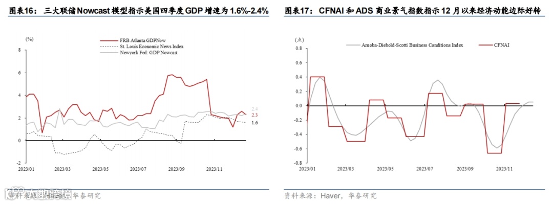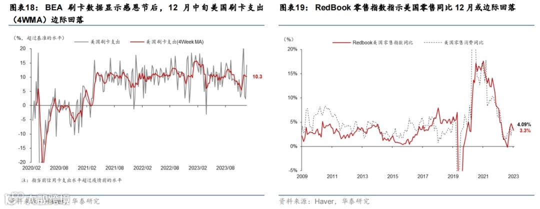 12月数据显示美国增长边际放缓,四季度整体显著弱于三季度(图表16和17),圣诞节消费可能偏弱(图表18和19),地产因房贷利率回落小幅改善但仍处低位,企业投资边际走弱。我们预计2024年美国增长明显减速,主要推动因素为金融条件收紧,超额储蓄消减及真实收入增长减速,财政刺激边际退潮,及金融系统脆弱性上升等。