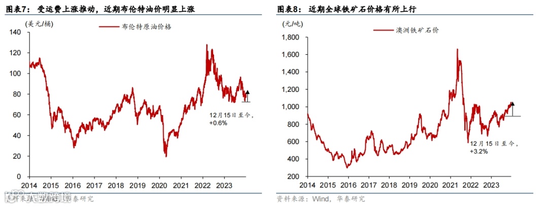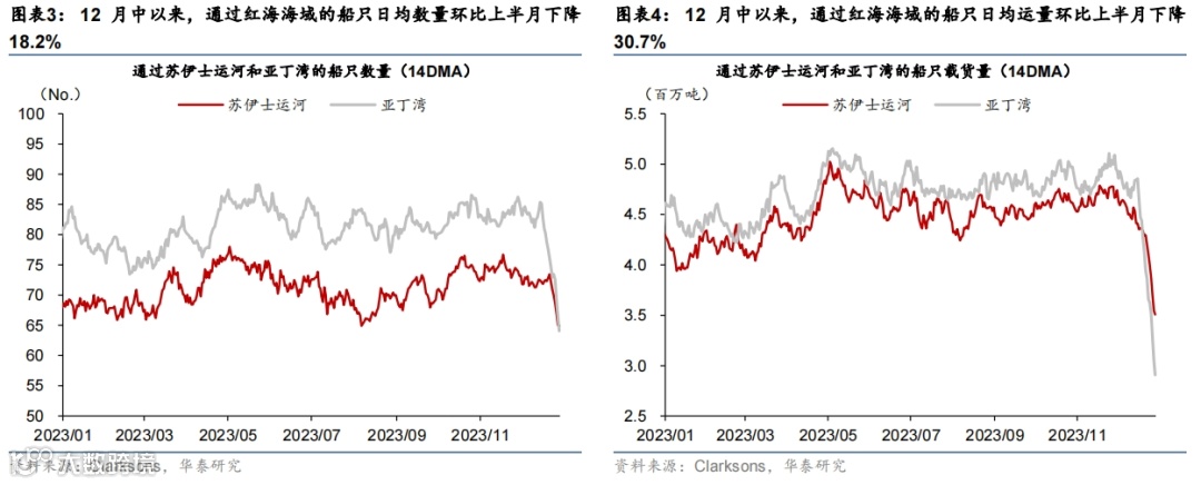 如果未出现极端的供不应求的局面、且扰动持续时间较短,则航运运量所受的冲击将较为有限。在明年全球航运运力整体供过于求的背景下,短期运价更多地是由对海运时间较为敏感的需求推升,而对海运时间不敏感的需求可能会推迟。如果红海事件持续的时间较短,未来被抑制需求可能会陆续释放,整体运量受到的影响可能较为有限。