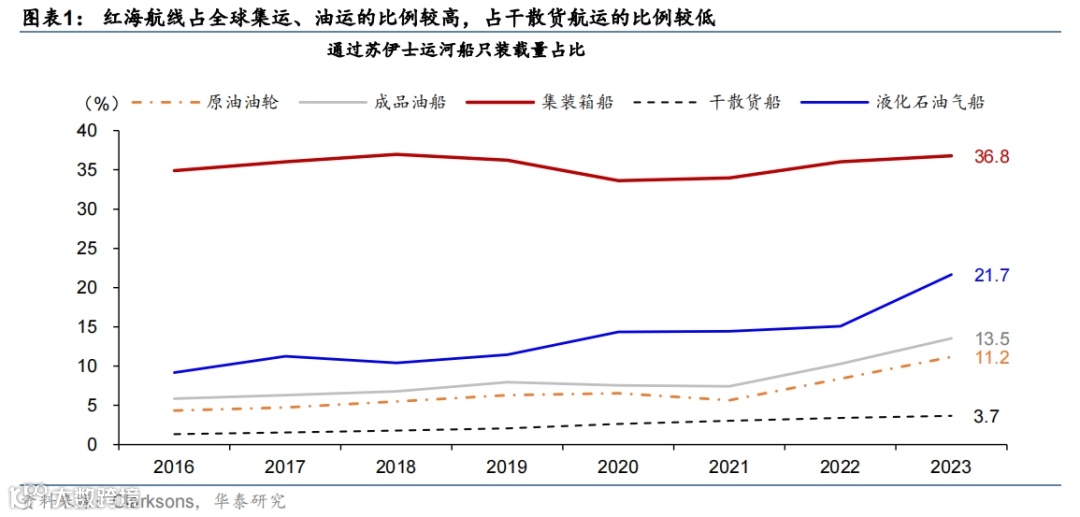 干散货航运:影响相对有限——途径苏伊士运河的航线占比较低。