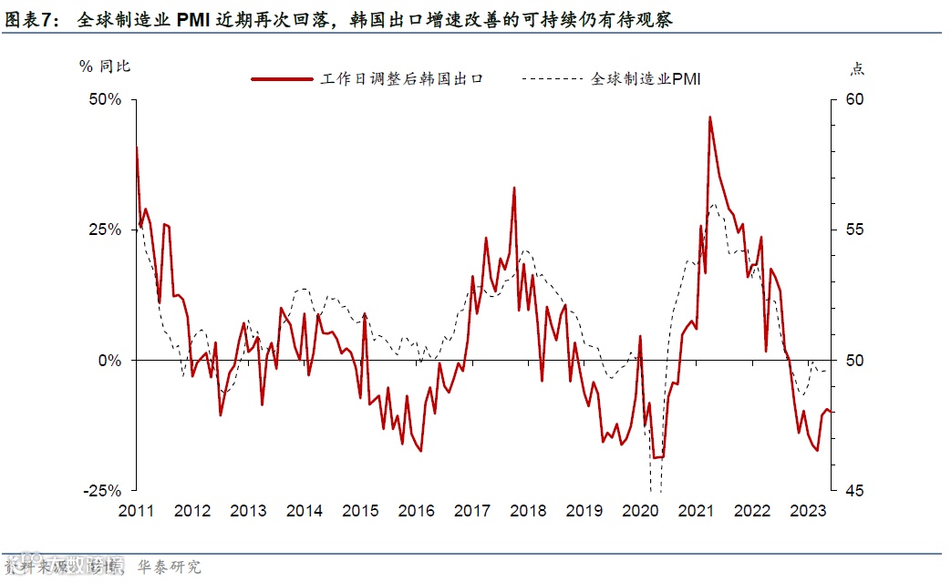 往前看,韩国出口动能有所修复,特别半导体相关出口,但中国内需偏弱以及全球制造业PMI维持疲弱可能带来拖累,韩国出口或低位企稳。一方面,受全球半导体周期下行拖累,半导体相关出口是韩国出口的主要拖累因素,近期跌幅明显收窄,例如半导体从4月的-41%收窄至6月的-28%。未来半导体周期能否持续改善需要密切关注。但另一方面,韩国工作日调整后的日均出口改善幅度不大,中国内需仍有待进一步改善,以及全球制造业PMI持续低于荣枯线(图表7),韩国出口也面临一定的下行风险。总体来看,下半年韩国出口上下行风险并存,或低位企稳。