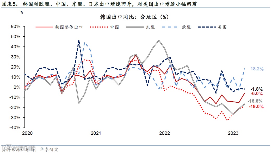 分国家/地区看,基数效应显著推升韩国对欧盟出口,对中国、东盟的出口有所改善但跌幅仍深,对美国出口增速小幅回落。中国是韩国最大出口目的地(2022年约占韩国总出口的23%),6月韩国对中国出口同比增速为-19.0%,较5月回升2.1个百分点,但跌幅仍深(图表5),拖累韩国出口4.3个百分点(图表6),或反映中国内需有待进一步改善。新兴市场方面,6月韩国对东盟的出口回升4.6个百分点至-16.6%,跌幅仍深。从对发达国家的出口来看,基数效应显著推升6月韩国对欧盟出口,同比增速大幅回升21.2个百分点至18.2%;对美国出口同比录得-1.8%,连续三月为负,或反映美国相关商品消费需求小幅走弱。