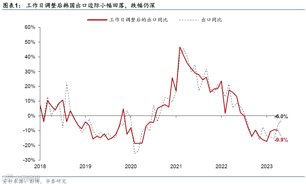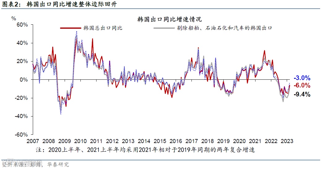 6月韩国出口同比增速回升9.2个百分点至-6.0%,不及彭博一致预期(-3.6%);工作日调整后的日均出口同比增速为-9.9%,较5月小幅下行0.6个百分点;但半导体相关产品出口增速跌幅收窄(图表1)。分产品看,半导体、计算机、手机等产品出口增速边际回暖,汽车出口保持高景气且仍在持续上行。分国别看,对欧洲、日本、中国和东盟的出口均边际回升,对美国出口下滑。剔除波动大的船舶业和转口贸易为主的石油石化出口后,韩国出口同比增速为-3.0%,较5月回升7.2个百分点,边际改善幅度小于总出口(图表2)。整体来看,韩国出口增速边际回暖,半导体相关产品出口跌幅也出现收窄,全球半导体周期改善能否持续有待进一步观察。