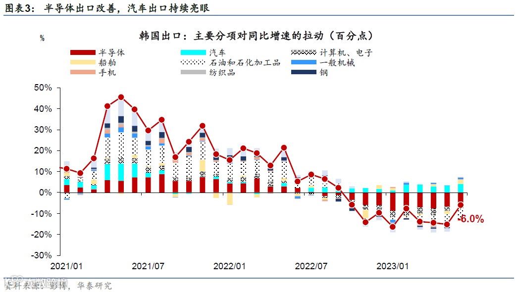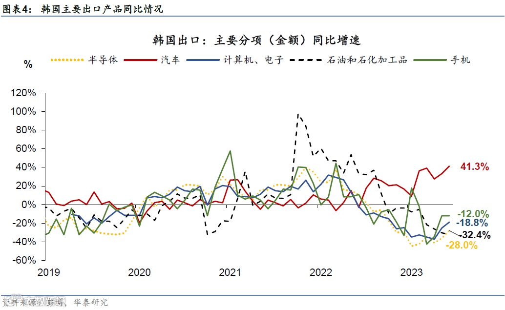 分产品看,半导体、手机和计算机出口增速边际回暖,石油石化出口持续回落,汽车出口维持高增速。半导体是韩国最重要的出口品类(22年占韩国出口的19%),6月同比增速回升8.2pct至-28.0%(图表3),拖累出口增速6.0个百分点(5月拖累6.8个百分点),或反映全球半导体周期拐点将近。计算机、手机等电子产品出口同样小幅改善:6月计算机同比增速边际回升6.4pct至-18.8%,手机出口跌幅收窄至-12.0%。石油石化出口延续回落趋势,6月同比跌幅加深2.1个百分点至32.4%,或反应6月原油价格仍然低迷。汽车是今年拉动韩国出口幅度最大的品类,6月保持了高速增长,同比增速回升8个百分点至41.3%,拉动出口4.2个百分点(5月拉动同比3.3pct)(图表4)。