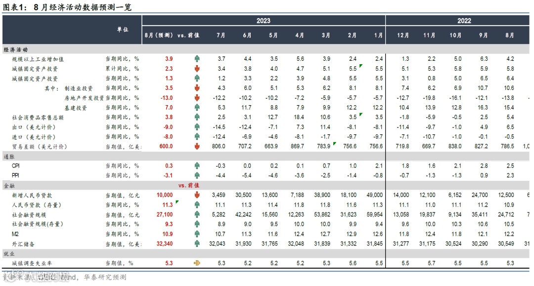 货币财政:预计8月新增贷款1万亿元、社融约2.71万亿元。此外,M2增速预计略有回升。预计8月人民币贷款同比增速小幅回升至11.3%,地产需求仍待回升、但地方债发行明显有所加速。高频数据显示,8月政府债券同比大幅多增或推动社融同比增速回升至9.3%。财政方面,8月专项债发行规模有所加速,且政治局会议明确提及将延续减税降费政策,财政扩张或将进一步发力。此外,根据此前政策,今年3.7万亿元的地方债额度将在9月底前发放完毕,如果4季度增长仍面临压力,我们认为,不排除将2024年地方债额度在今年提前使用。