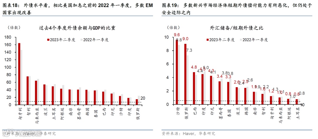 从短期外债偿付能力(外汇储备/短期外债之比),与2022年一季度相比,多数新兴市场国家有所下滑,但仍处于安全边际之内。截至2023年三季度,大多数国家的外汇储备与短期外债之比与去年同期比,呈现下滑态势,但多数国家仍远高于100%的国际警戒线。需要注意的是,土耳其、阿根廷等国的外储与短债之比仅80%左右,且呈现下行态势,可能有较大的债务违约风险(图表19)。