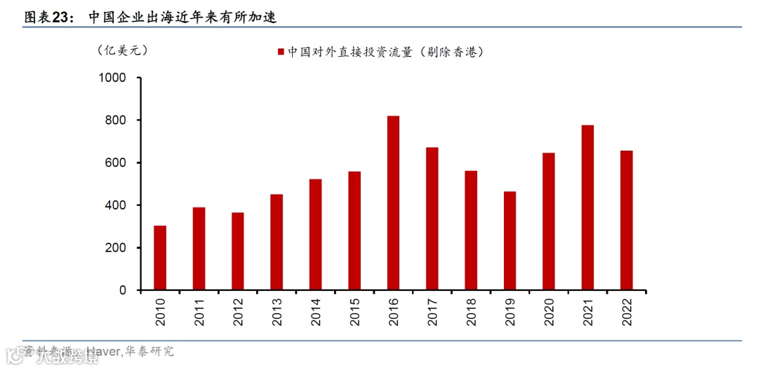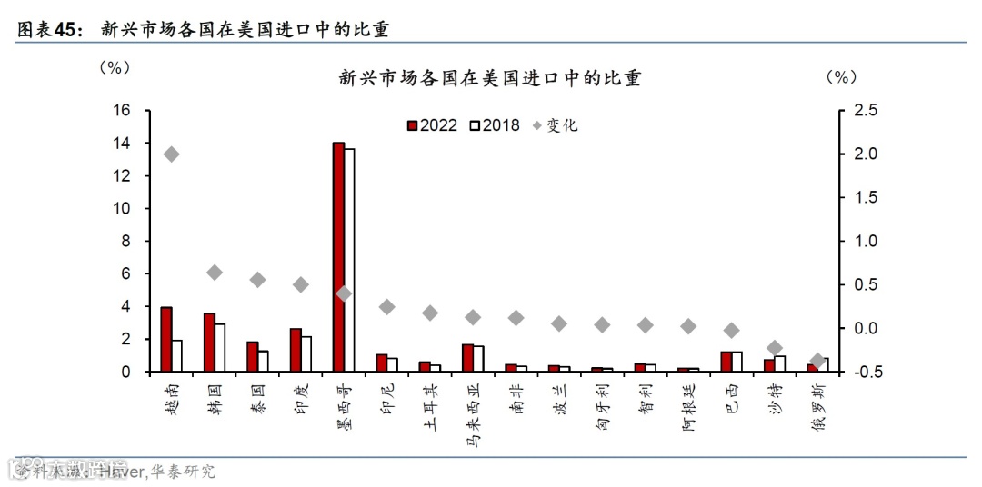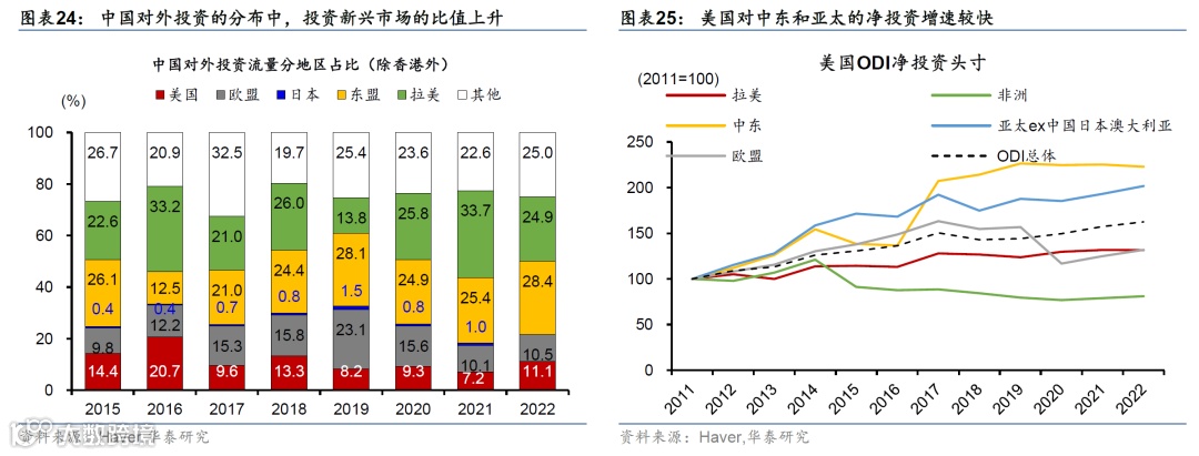 中国产业链重塑,叠加全球供应链更为多元化,中国和西方国家对东盟、南亚、拉美等地区直接投资比率上升(参见《中国出口产业链的升级与重塑》,2023/4/16)。