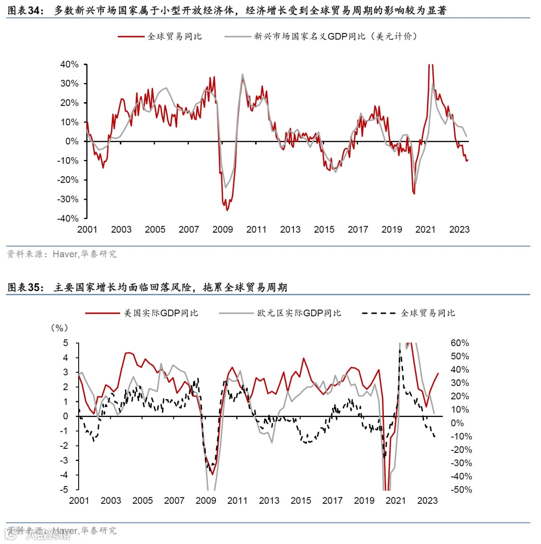 总体而言,中国以外的新兴市场国家明年增长和金融稳定或将面临更大的挑战,我们综合外债、汇率、财政、通胀、杠杆率等指标合成了新兴市场脆弱性监控系统,部分拉美和东欧国家脆弱性更高,如阿根廷、匈牙利和土耳其等。2024年随着疫后重启的“脉冲”消失,财政紧缩压力上升,2024年新兴市场实际和名义增长可能会整体减速。IMF预计,2024年巴西、墨西哥等增速或分别放缓1.6pct/1.1pct至1.5%/2.1%。同时,新兴市场财政扩张空间收缩;而全球美元无风险融资利率高企,将进一步边际收紧新兴市场的金融条件。