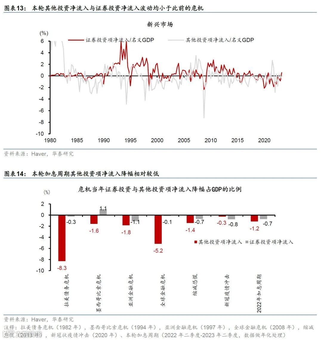其他资本项目是支撑本轮金融项目资本流动不发生较大变化的主要原因。其他投资项目主要是银行渠道的资本流入,包括贸易信贷、贷款、货币和存款等。银行资本流入的变化对新兴市场影响较大,原因是银行危机、货币危机以及资本流入的突然逆转容易相互强化,且银行渠道资本流入骤停或者逆转直接冲击信贷供应(Roberto Chang和Andres Velasco(2001))。本轮加息周期,其他项目净流入下降1.2%,小于除2020年新冠疫情以外历史上主要的新兴市场危机的净流入(图表13 – 图表14),原因可能是在2008金融危机之后,全球监管机构对银行监管加强,巴塞尔协议III显著增加了发达经济体银行的资金成本,导致银行开始优化海外资产。