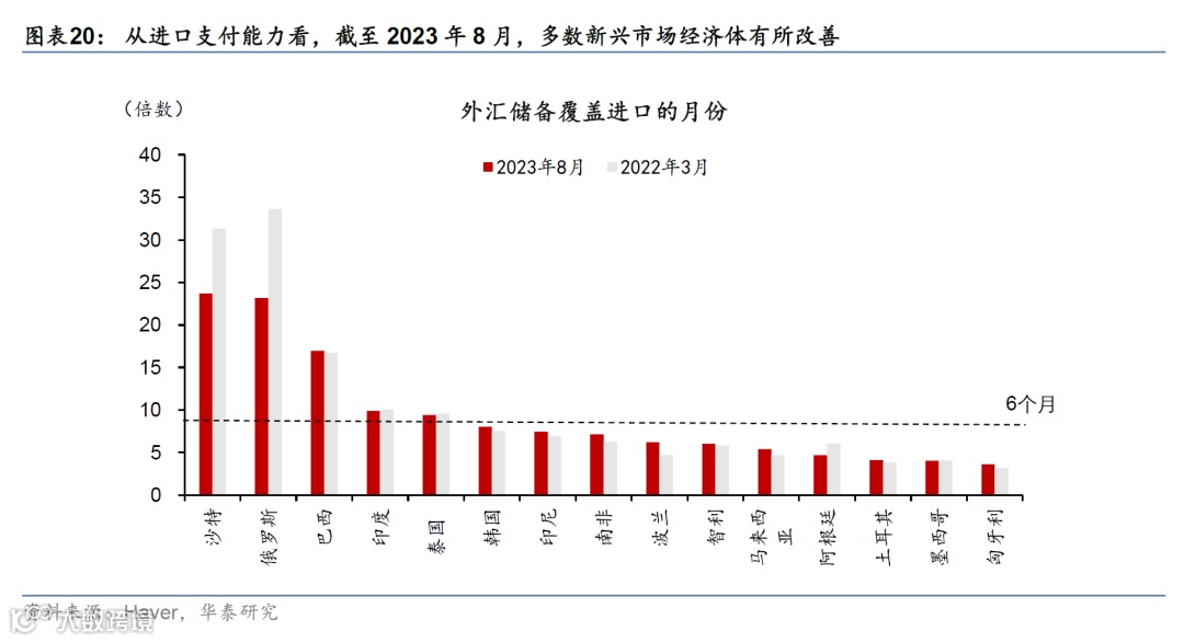 从进口支付能力看,截至2023年8月,多数新兴市场国家有所改善。2023年8月,多数国家外汇储备覆盖进口的月份数相对去年同期有所增加。国际上多数国家的外汇储备可以达到或者接近覆盖进口6个月,且相比美国加息前的去年3月边际提高。新兴市场经济体中,土耳其(4.1)、阿根廷(4.7)、墨西哥(4)和匈牙利(3.6)等国据此有较大的差距(图表20)。