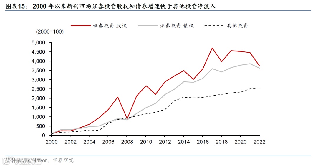 本轮加息周期,新兴市场国家证券投资净流入下降较为显著,是未来值得关注的潜在风险点。证券投资包括外国投资者通过购买本国债券、股票、衍生品等进行的投资,投资主体主要是共同基金、对冲基金等非银金融机构。2000年以来新兴市场证券投资股权和债券增速快于其他投资净流入(图表15)。本轮加息周期,新兴市场国家证券投资净流入下降较为显著是未来值得关注的潜在风险点。
