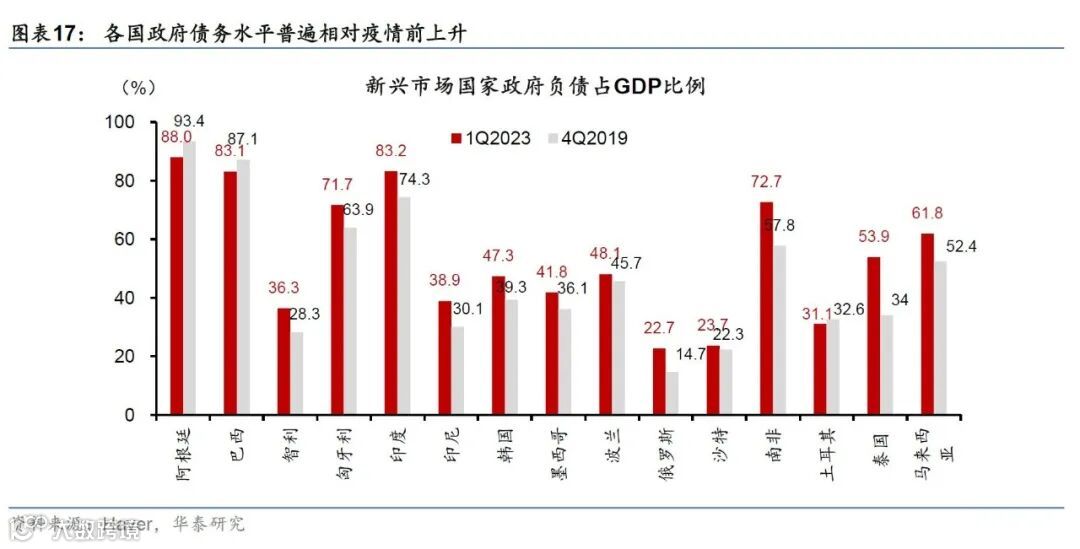 财政赤字方面,多数国家边际改善,但有一定分化,且各国债务水平普遍相对疫情前上升。由于疫情相关刚性支出逐步回落,多数国家2022年财政赤字与2021年持平或者有所下降。但韩国2022年财政赤字较2021年明显扩大;匈牙利、印度、南非和巴西等财政赤字占GDP之比均高于4%,而匈牙利、印度和南非的财政赤字水平较2008年和2015年有明显的扩张。此外,疫情后各国债务水平普遍上升,加大了中期财政紧缩压力。政府债务水平方面,由于疫情期间新兴市场财政赤字加大,各国债务水平普遍有所提高;例如2023年一季度智利、匈牙利、印度的政府债务占GDP比重相较2019年四季度分别上升8、7.8和8.9个百分点至36.3%、71.7%和83.2%(图表16-图表17)。