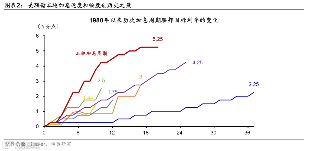 美元加息周期通常会冲击新兴市场经济体。1978-1981年,美国联邦基金利率从7% 左右上升到接近20%,1982年爆发拉美债务危机;1994年2月至11月,美联储累计加息250个基点,爆发墨西哥比索危机;1997年美国政策利率维持在5.5%左右的相对高位,爆发亚洲金融危机;2013年缩减恐慌导致新兴市场经济体资本外流,且汇率大幅贬值。