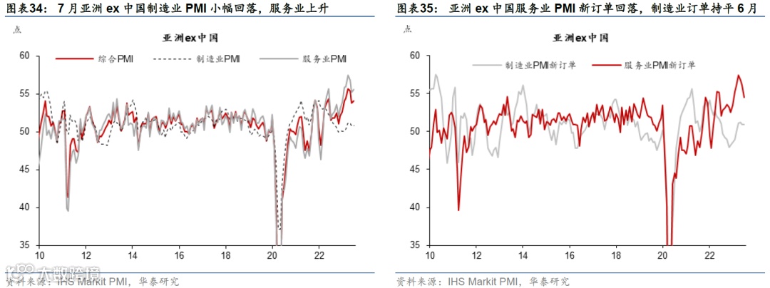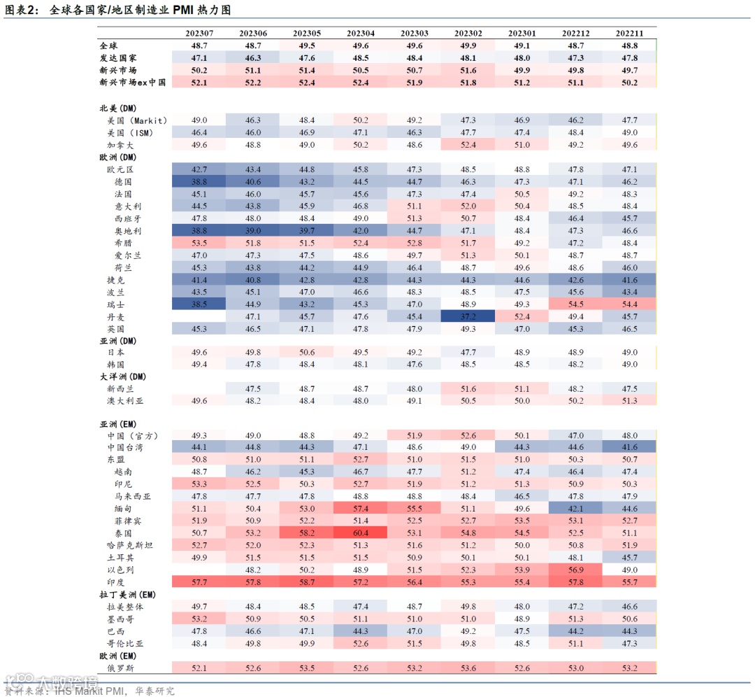 7月全球制造业持平于48.8,连续11个月位于荣枯线以下;服务业PMI降1.2pp至52.7,连续2个月回落,各国服务业PMI普遍下降。