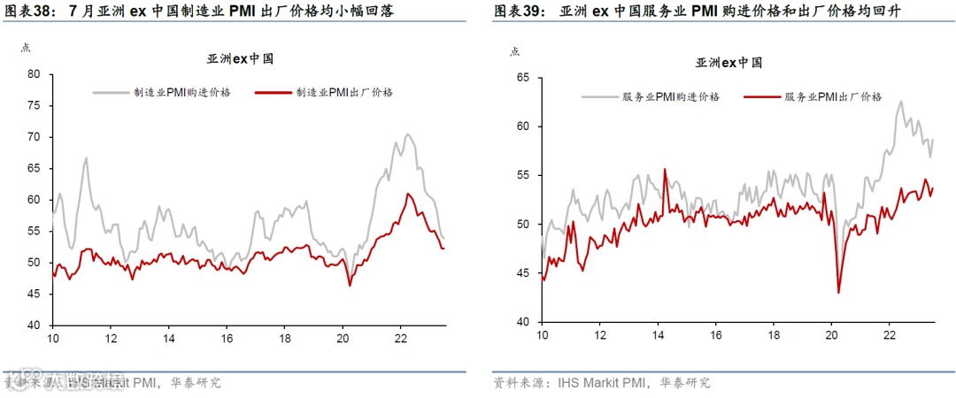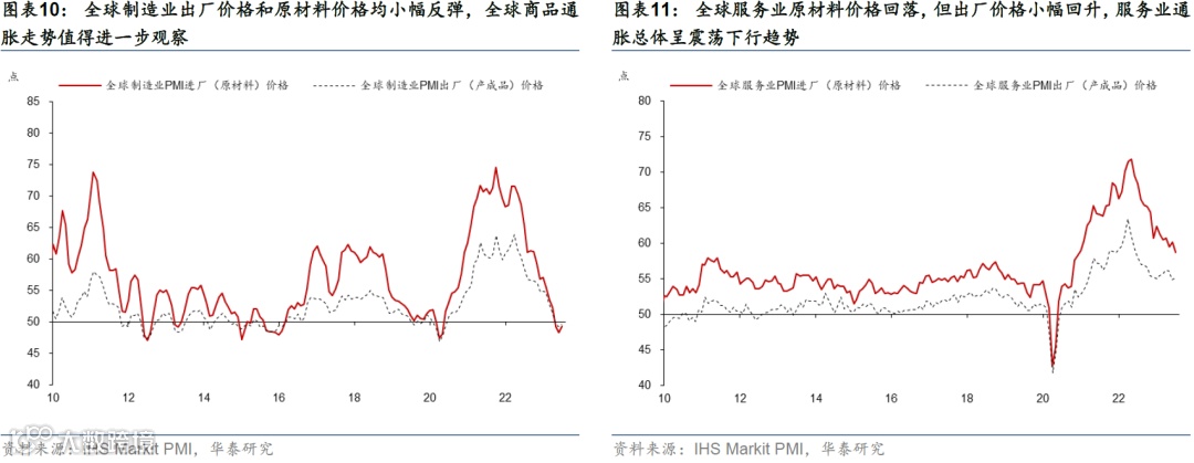 服务业价格走势总体继续回落:全球服务业PMI原材料价格分项下降1.4pp至58.7,但出厂价格分项回升0.2pp至55.1。