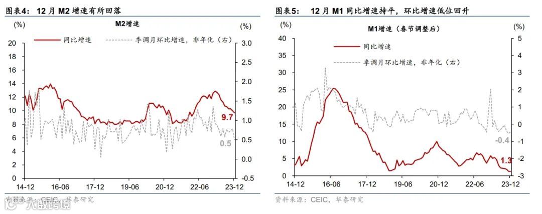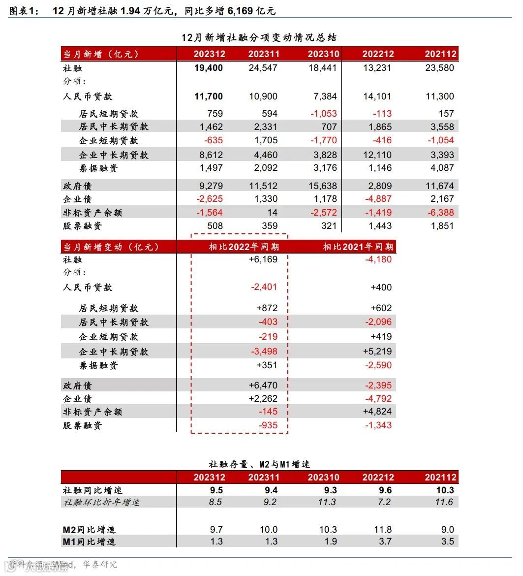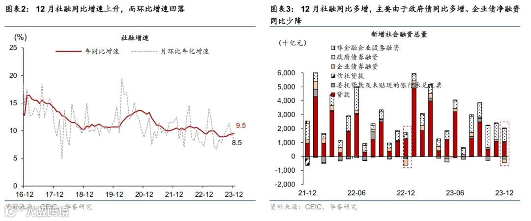 数据快评:2023年12月社融同比增速小幅上升,主要由政府债同比多增提振,而私有部门融资需求仍待修复。具体看,2023年12月新增人民币贷款1.17万亿元,同比少增2,401亿元,主要由于企业中长期贷款同比少增;12月新增社融1.94万亿元,同比多增6,169亿元(图表1)。由此,12月社融同比增速从11月的9.4%小幅加快至9.5%,但(季调后)月环比折年增速从9.2%放缓至8.5%(图表2)。从分项看,12月社融同比多增,主要由于政府债与企业债净发行同比多增,其中政府债扩容是靠增发国债拉动,而企业债净融资同比多增是因为2022年12月债市舆情事件导致的低基数。货币增长方面,12月M2同比增速回落0.3个百分点至9.7%,主要由于居民存款同比明显少增;M1同比增速持平于1.3%,反映企业现金流仍待改善。