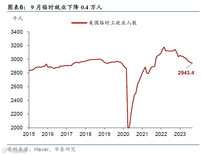 9月非农新增就业显著超预期,服务就业是主要支撑,商品就业仍在放缓。9月服务业新增非农就业23.4万人,较8月上升10.4万人。其中,受暑期出行提振较大的休闲酒店业新增非农就业达到9.6万,是8月新增非农就业的2倍以上;除医疗保健业外的多数服务行业新增就业也较8月增加(图表5)。9月商品部门新增非农新增就业仍在放缓,9月仅为2.9万人。其中,建筑业新增就业仅为1.1万,较8月大幅下降2.5万,显示房贷利率不断攀升打压房地产相关需求。由于对经济周期更敏感的临时就业9月进一步下降0.4万(图表6),且9月Markit和ISM服务业PMI分别回落0.4和0.9pct至50.1和53.6,当前服务业就业的高景气或难以持续,甚至不排除后续出现一定程度的下修。