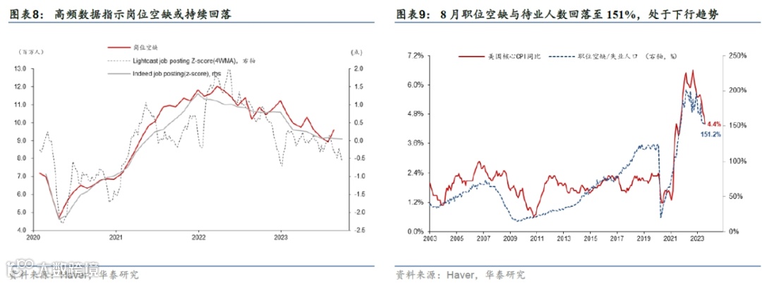 9月小时工资环比增速仅为0.2%,低于预期(0.3%),其中商品部门工资环比增速上行,服务部门放缓。9月小时工资环比维持0.2%,3个月季比折年从8月的4.4%大幅回落至3.4%。其中,商品部门的时薪环比回升0.1pct至0.3%,而3个月季比折年增速从6.0%回落至5.0%;服务部门时薪环比回落0.1pct至0.2%,3个月季比折年增速从3.9%回落至3.0%。就业超预期,且劳工薪资同比增速放缓显示劳动市场供给修复为就业市场降温,美国超额劳工需求仍在正常化。虽然8月岗位空缺超预期回升至961万人,但岗位空缺与失业人数之比回落至151%,且高频指标Indeed job posting和Lightcast job posting均指示岗位空缺的回升或不可持续(图表8)。