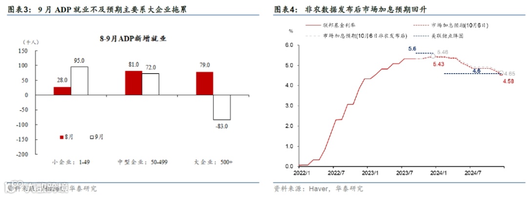 9月美国新增非农33.6万(企业调查数据),显著高于彭博一致预期的17万人, 8月上修4万人至22.7万人;小时工资环比持平于0.2%,低于彭博一致预期的0.3%;失业率维持在3.8%,高于彭博一致预期的3.7%;劳动参与率录得62.8%,与彭博一致预期一致(图表1)。9月家庭调查显示新增非农就业仅为8.6万,与失业率高于预期一致,但由于家庭调查样本量小于企业调查,超预期的企业调查数据更有信息量。此外,9月非农就业与ADP就业再次出现明显背离(图表2),部分是因为非农数据中包含表现较好的政府就业,且侧重于大企业的ADP数据中大企业新增就业明显下滑(图表3)。数据公布后市场加息预期回升,美元和美债收益率整体上升,美股先跌后反弹:截至北京时间10月6日晚上22:15,相对数据发布前,美元指数上涨0.3%至106.7,2年期和10年期美债分别上行3bp和8bp至5.09%和4.82%,美股三大股指下跌后反弹,纳指下跌近1%随后转涨;市场隐含的美联储11月-12月累计加息概率从39%升至50%,首次降息时点维持在2024年7月,2024年底政策利率预期上行9bp至4.65%(图表4)。