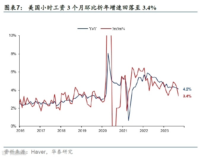 往前看,虽然9月新增非农就业大超预期,一定程度推升加息预期,但11-12月是否加息仍需要观察后续数据表现。考虑到非农数据波动较大,且四季度美国增长存在下行风险,超预期新增非农就业或难以持续。近期美债收益率涨破4.8%,创2007年以来新高,叠加信用放宽、美元升值,美国金融条件明显收紧,或拖累增长(参见《如何判断联储是否会再加息?》,2023/09/24)。此外,高频/领先指标指示近期美国增长动能或进一步放缓(参见《增长和劳工需求降温但总体韧性犹存》,2023/9/24)。因此,我们认为9月超预期的非农数据尚不成为美联储在11-12月加息的充分条件,还需要观察后续数据表现,例如10月12日公布的美国9月CPI数据。我们维持此前的基准预测,如果金融条件继续收紧、就业市场继续降温、通胀维持偏弱态势,预计11-12月加息概率略低于50%(参见《联储如期暂停加息,指引偏鹰》,2023/9/21)。